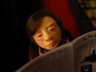 The male figure I made is dressed in striped pyjamas and a maroon, satin dressing gown. Round his neck he wears a scarf. His feet are bare.
