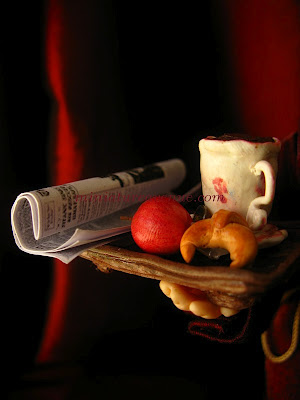 Included is a breakfast tray containing a cup filled with chocolate,