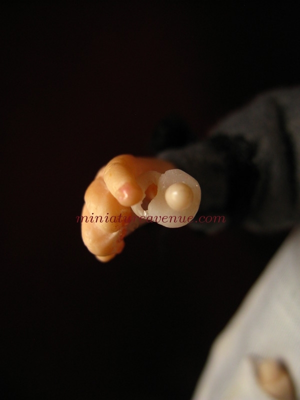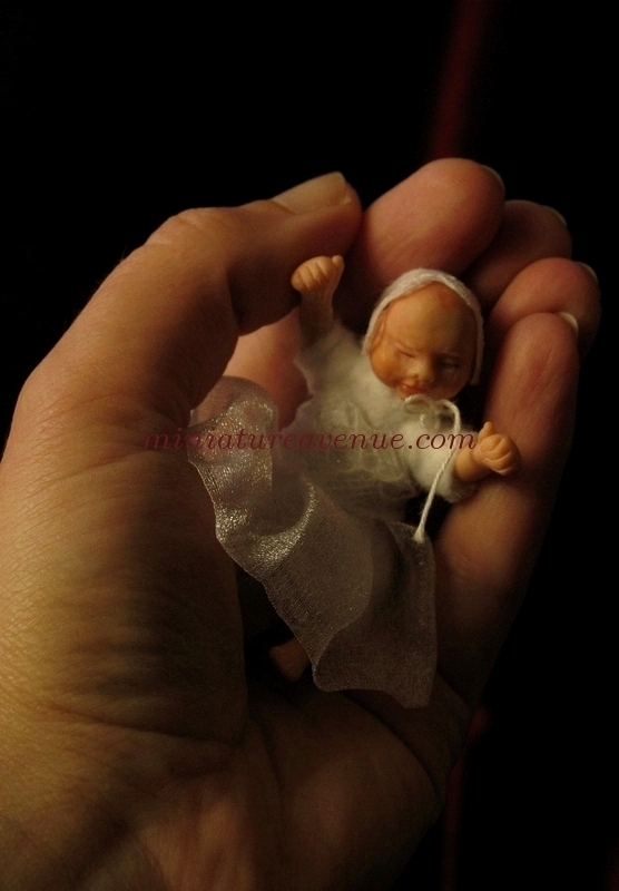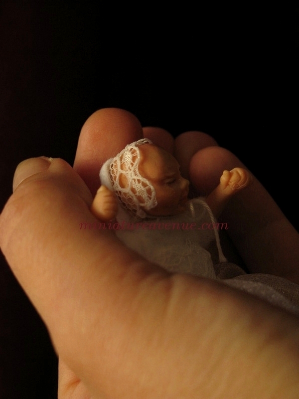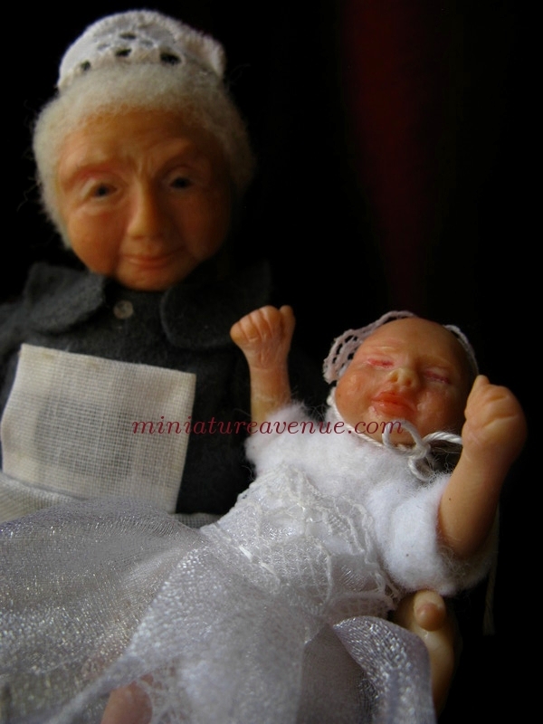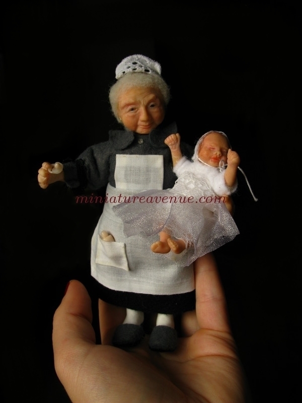 Just look at the figures I made. A nanny full of calm and a sleeping baby girl . It's 1:12 scale. The nanny is about 15 cm tall . She's old-fashioned. She has a grey blouse, a black skirt and a white apron. In the apron's pocket a baby bottle is hidden. In nanny's right hand there is a dummy (not larger than 0.5 cm). On the nanny's grey hair there is a white nanny's cap. The baby girl is 6.5 cm tall . She is dressed in a white dress and a white baby cap that can be removed.