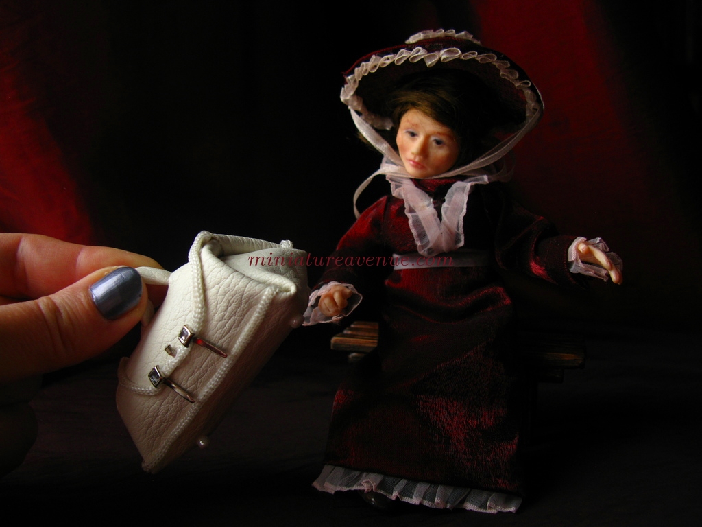 In the meanwhile, however, I would like to present another doll I made last year: A woman on her way. She is 16 cm tall. She wears maroon dress and hat, both finished with a light pink ribbon. Her brown booties are made of polymer clay.