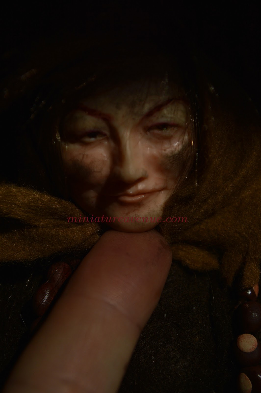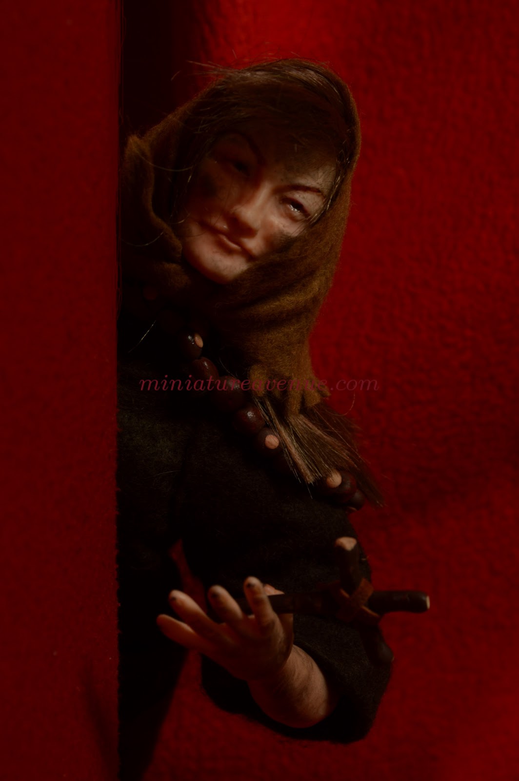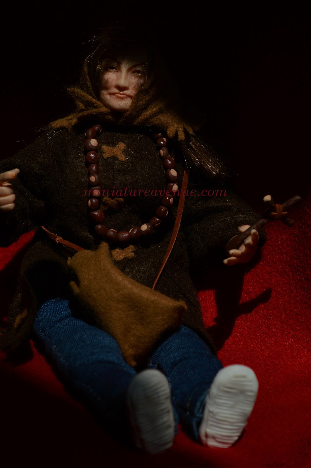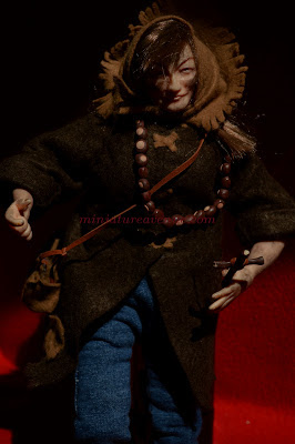 My doll is 25 cm tall. She's not tidy. She carries a large cross in hand and she has a necklace made of chestnuts around her neck, and a large bag filled with potatoes. She is also dressed in modern jeans and dark blue sneakers. This is because her legend is now preserved through the custom of people dressing and performing as Siuda Baba each year in and around Wieliczka.